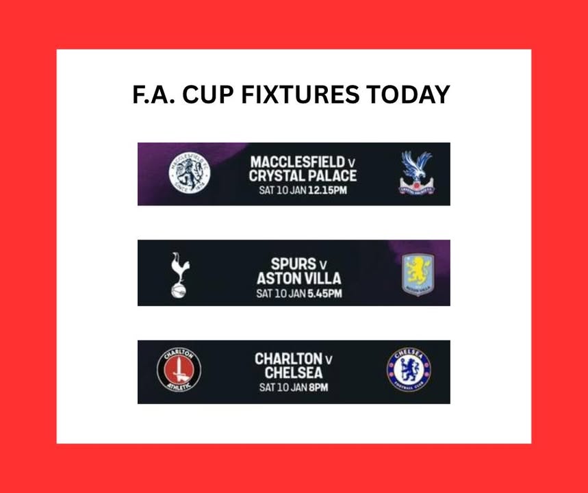 It's te magical round of The Emirates FA Cup, when the mighty premier league team enter, Can Macclesfield FC cause an upset against holders Crystal Palace Football Club, Or will the pressure of local rival Charlton Athletic FC cause Chelsea Football Club to falter. Our matches showing today, and there more to come tomorrow.