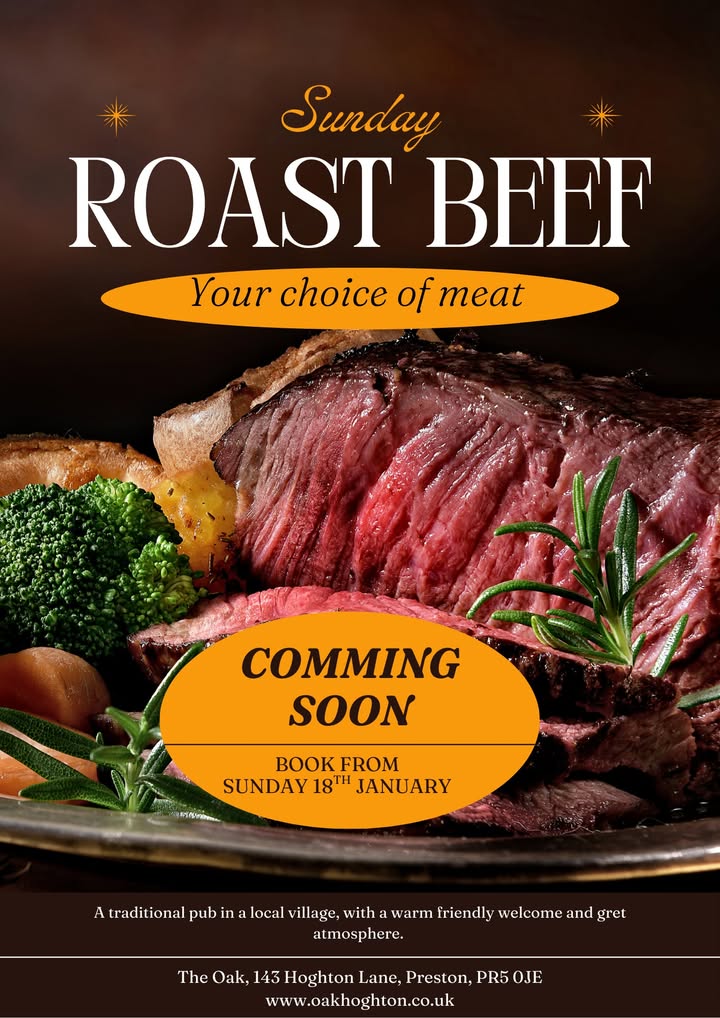 We're changing Sundays: Our new look menu's will be slighty reduced from the main menu, but with the option of a Roast Dinner, serving Beef, Pork or Chicken. Fancy your chance of winning a Roast dinner for you and 3 friends or family members? Comment below with your favourite meat option, and tag your firends to enter. Closing enteries is Friday 16th at 7pm. You must be available on Sunday 18th to claim your prize. Sunday Roasts will be subject to availability booking is recomended by the link below https://www.oakhoghton.co.uk/ #sundayroast #sundayroastbeef #roastdinner #roastbeef #roastpork #roastcickendinner #preston